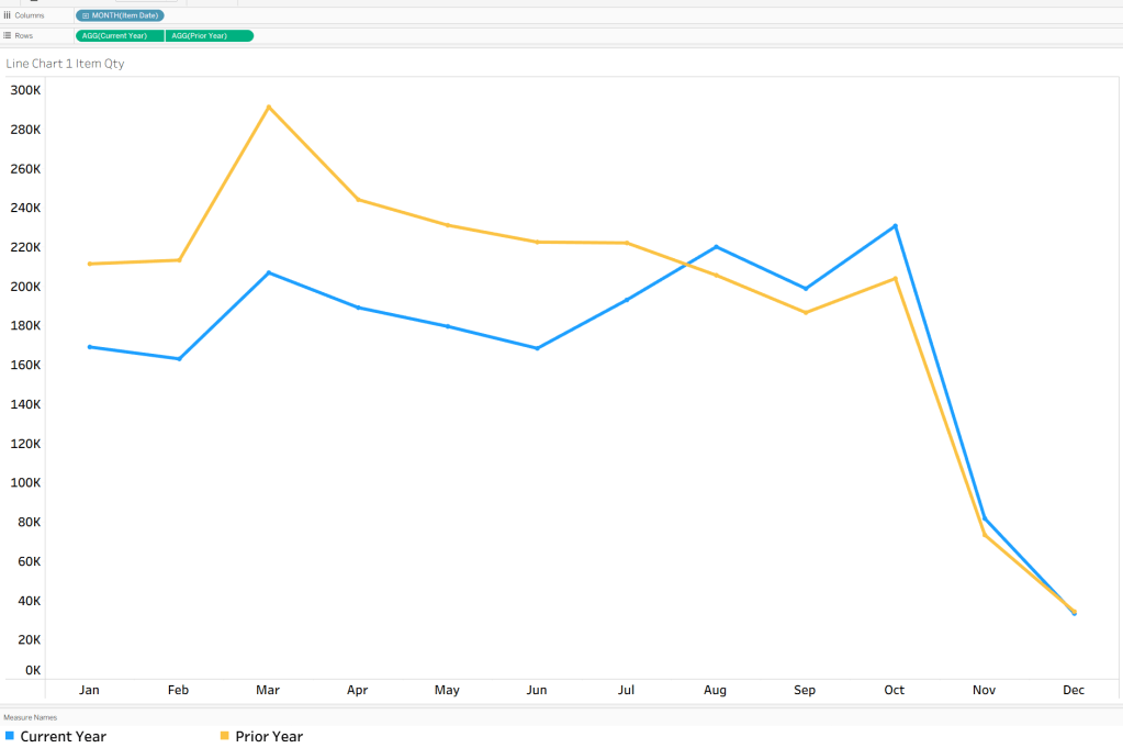 Be sure to chart by Event Date or Consumption Date, even though your calculations looks at sales by when they occurred. For this current product type and product, we see that it was pacing down YoY, but in August 2025 pace of sales increased. This report is looked at on a daily base by users for specific use cases to check performance — very useful and Tableau is great at letting people dynamically change filters. Thousands of reports in one!