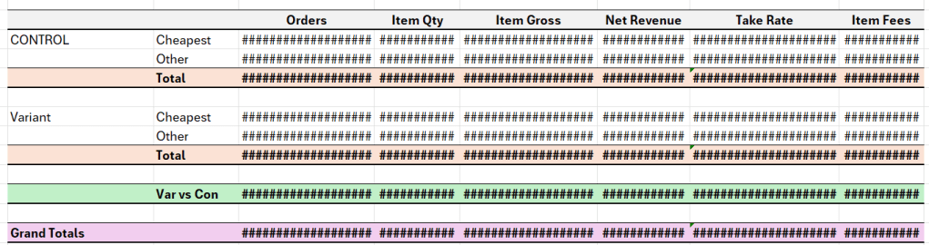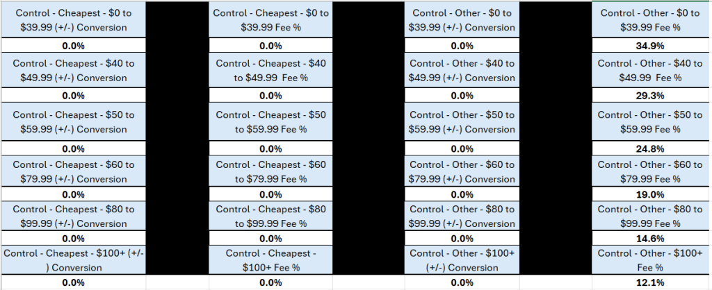 The good thing was that when I build a model in Excel, if the parameters are built correctly, only the fee inputs need changed to look at difference scenarios. These are all of the inputs I needed — (1) increase or decrease in sales/conversion (2) % Fee Levels by Control/Variant by Price Bucket