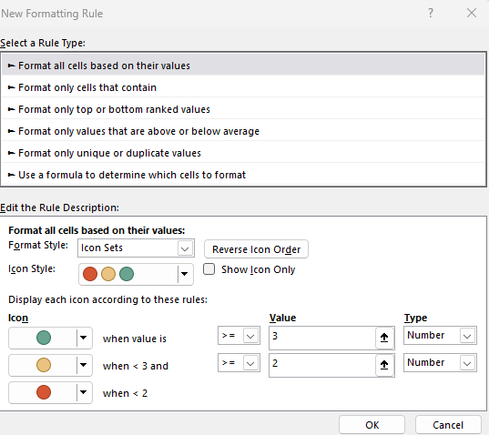 Click “Icon Sets” –> Then Click “More Rules”. Make it look like this picture below